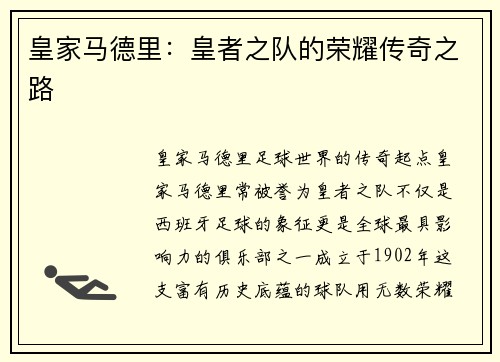 皇家马德里——足球世界的传奇起点 皇家马德里,常被誉为“皇者之队”,不仅是西班牙足球的象征,更是全球最具影响力的俱乐部之一。成立于1902年,这支富有历史底蕴的球队,用无数荣耀和荣耀的背后故事,诠释了...