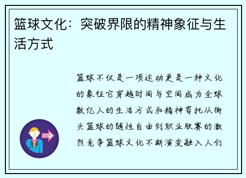 篮球不仅是一项运动,更是一种文化的象征,它穿越时间与空间,成为全球数亿人的生活方式和精神寄托。从街头篮球的随性自由到职业联赛的激烈竞争,篮球文化不断演变,融入人们常生活的点滴中。 街头篮球,是篮球文化...