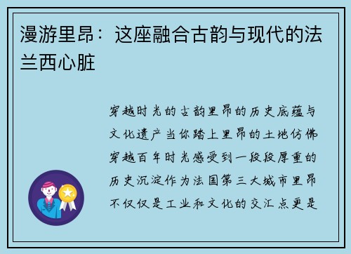 穿越时光的古韵:里昂的历史底蕴与文化遗产 当你踏上里昂的土地,仿佛穿越百年时光,感受到一段段厚重的历史沉淀。作为法国第三大城市,里昂不仅仅是工业和文化的交汇点,更是一座拥有千年历史的古城,古老的街巷和...