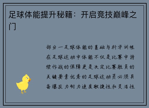 部分一:足球体能的基础与科学训练在足球运动中,体能不仅是比赛中持续作战的保障,更是决定比赛胜负的关键要素。优秀的足球运动员必须具备爆发力、耐力、速度、敏捷性和灵活性等多方面的身体能力。这些能力的提升,...