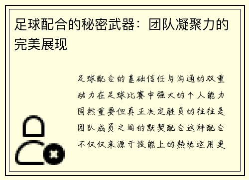足球配合的基础——信任与沟通的双重动力 在足球比赛中,强大的个人能力固然重要,但真正决定胜负的,往往是团队成员之间的默契配合。这种配合不仅仅来源于技能上的熟练运用,更源自于球队成员之间深厚的信任与高效...