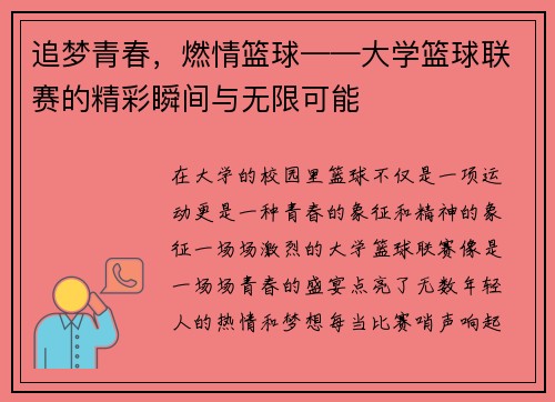 在大学的校园里,篮球不仅是一项运动,更是一种青春的象征和精神的象征。一场场激烈的大学篮球联赛,像是一场场青春的盛宴,点亮了无数年轻人的热情和梦想。每当比赛哨声响起,场上的学生运动员们用汗水浇灌着属于他...