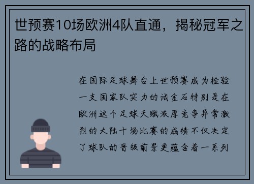 在国际足球舞台上,世预赛成为检验一支国家队实力的试金石。特别是在欧洲,这个足球天赋浓厚、竞争异常激烈的大陆,十场比赛的成绩不仅决定了球队的晋级前景,更蕴含着一系列深层次的战略布局。很多人好奇,为何欧洲...