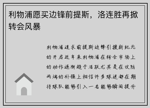 利物浦追求前提斯:边锋引援新纪元的开启 近年来,利物浦在转会市场上的动作逐渐趋于活跃,尤其是在攻防两端的补强上。相信许多球迷都在期待球队能够引入一名能够瞬间提升边路威胁的高水平边锋,而今年夏天,前提斯...